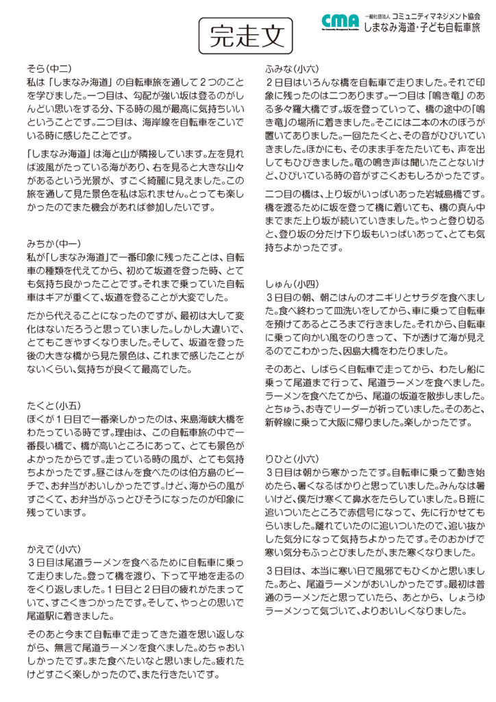 しまなみ海道 無事に 子どもたち15 名、大人6 名 伴走車2 台(4 名同乗)、合計25 名走破出来ましたことをご報告いたします。