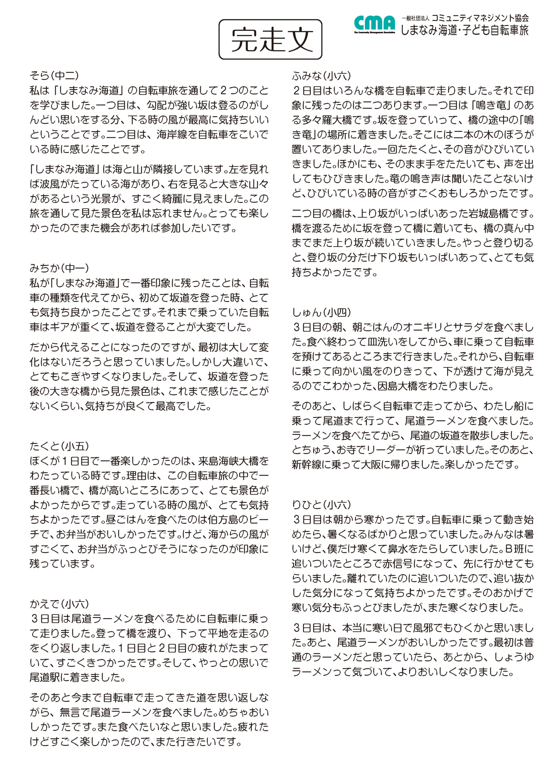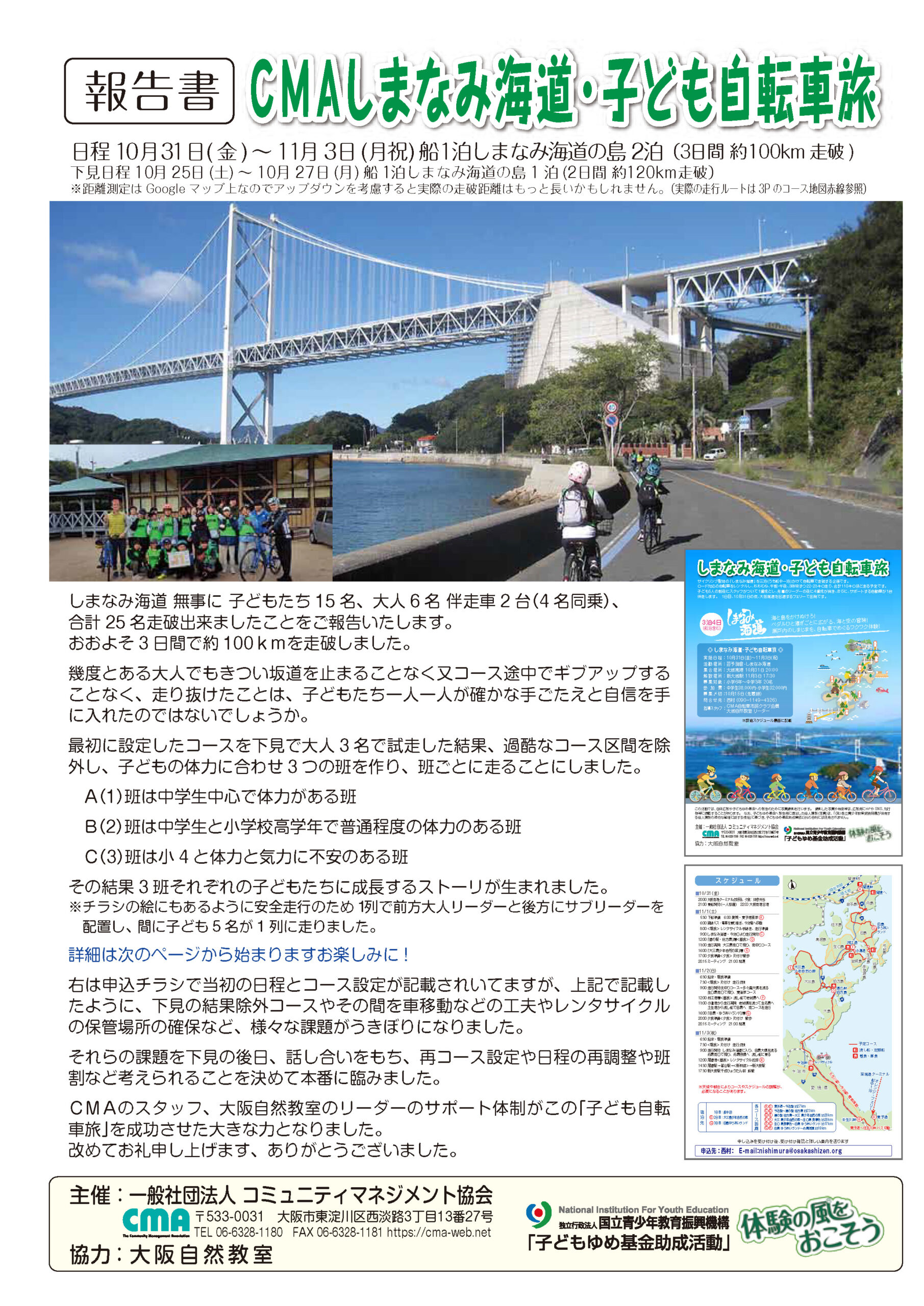 しまなみ海道 無事に 子どもたち15 名、大人6 名 伴走車2 台(4 名同乗)、合計25 名走破出来ましたことをご報告いたします。