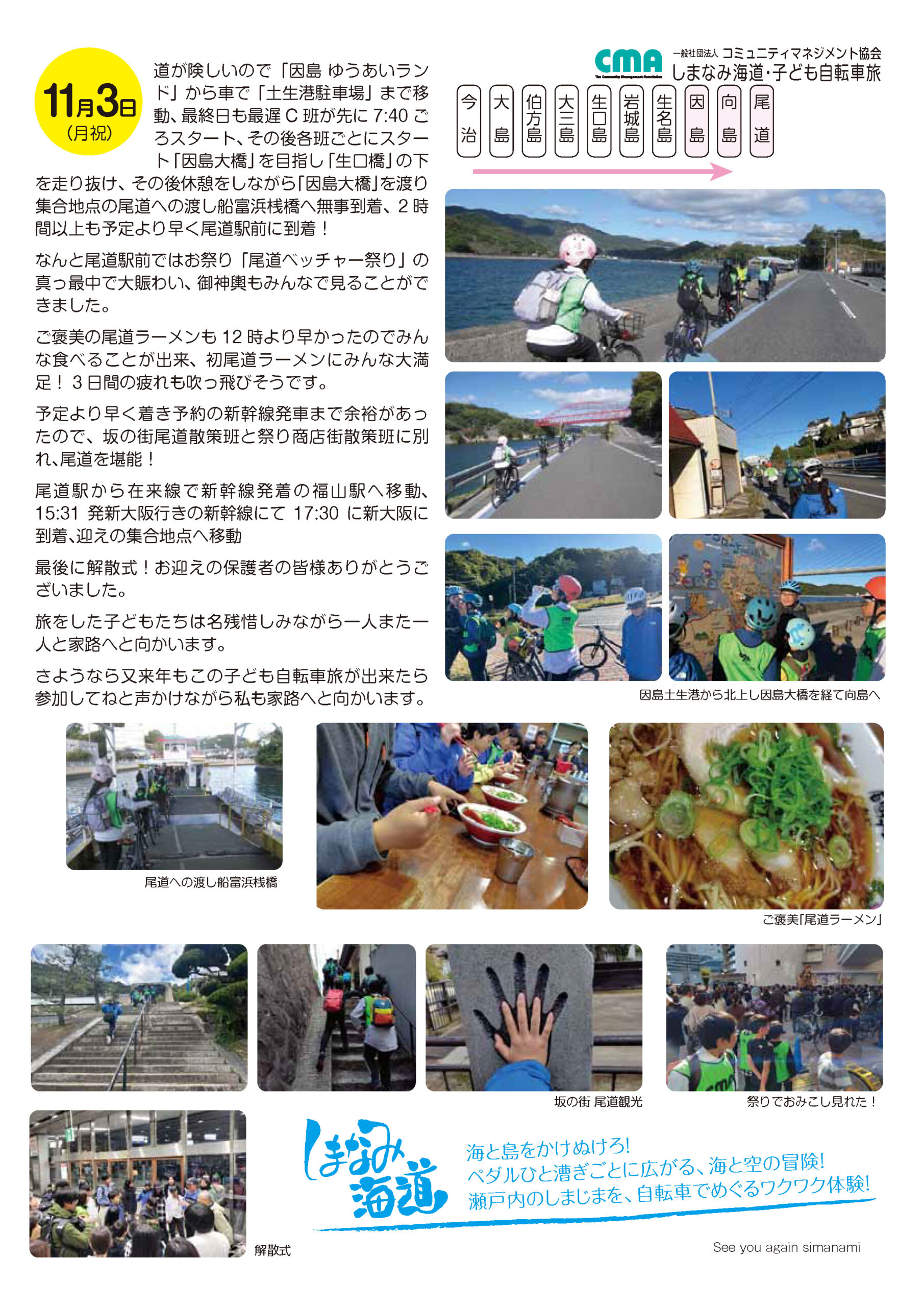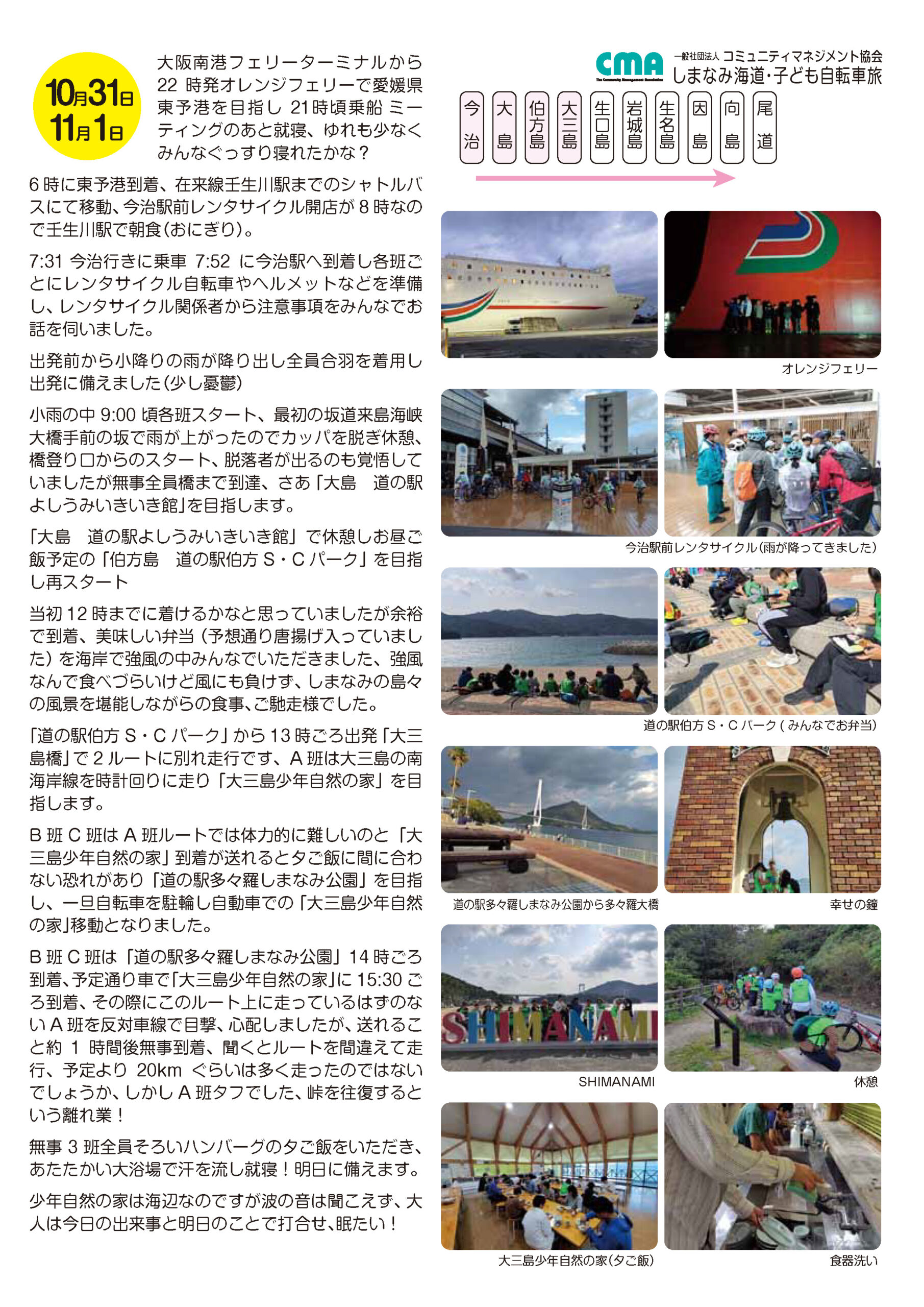 日程10月31日( 金) ~ 11月3日(月祝) 船1泊しまなみ海道の島2泊(3日間約100km 走破)